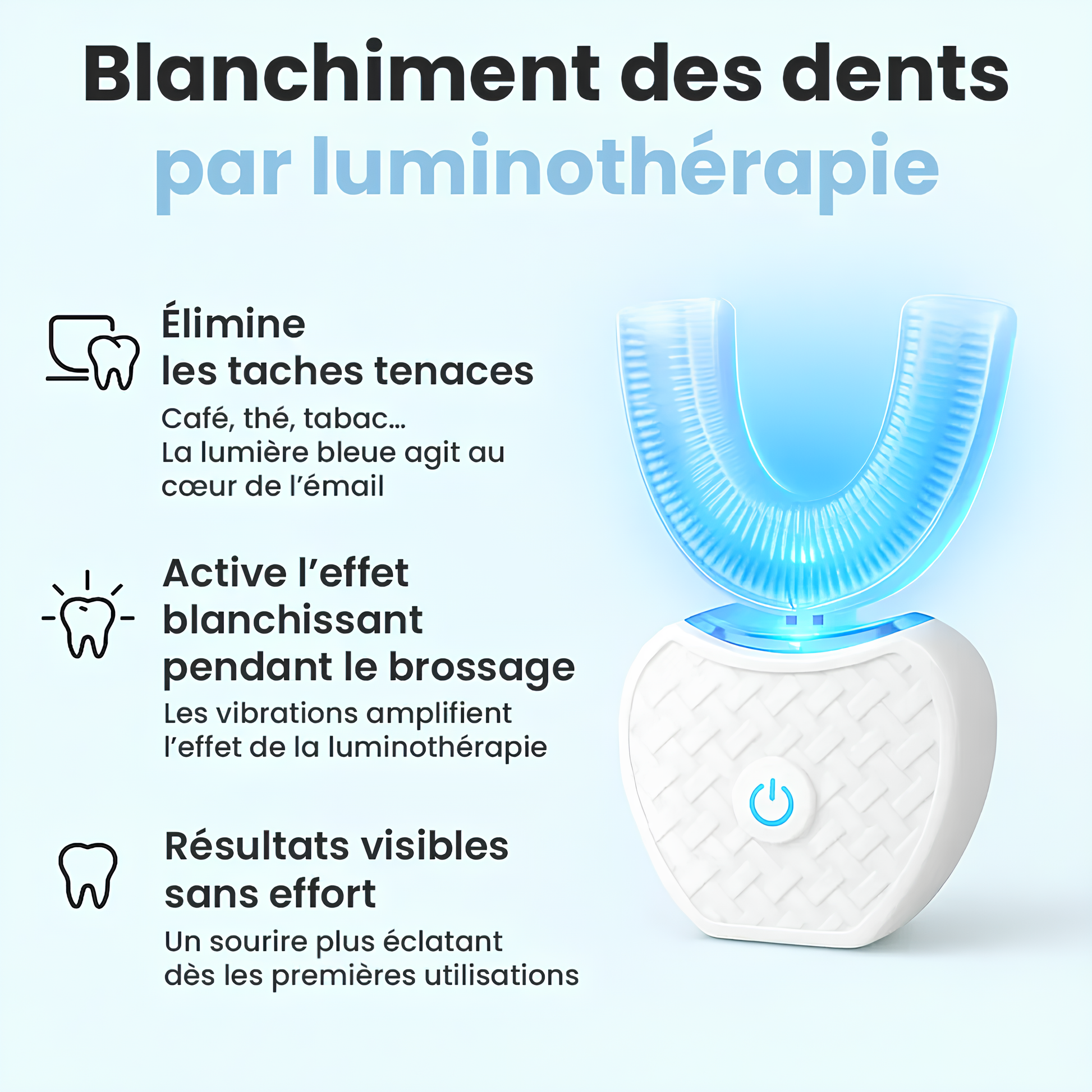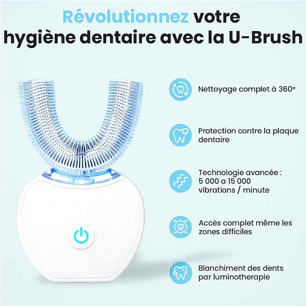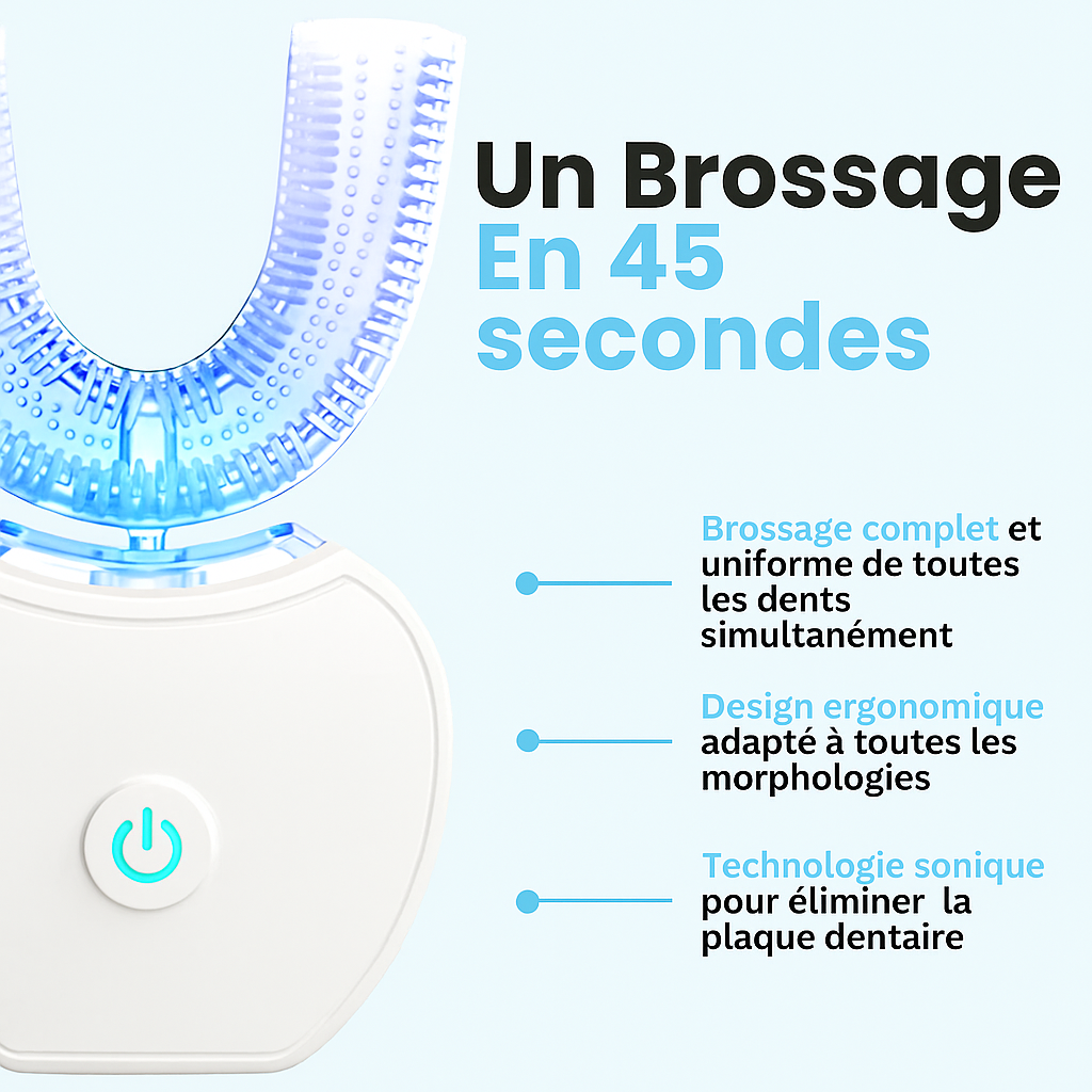 La brosse à dents automatique en U offre un brossage complet et uniforme en un temps record. Son embout en forme de U, doté de brins en silicone doux, enveloppe l’ensemble des dents pour un nettoyage 360° efficace, même dans les zones difficiles d’accès. Il suffit d’ajouter votre dentifrice, d’appuyer sur un bouton et l’appareil s’occupe du reste, tout en procurant un massage délicat des gencives. Idéale pour un usage quotidien, elle combine confort, rapidité et hygiène optimale, pour un sourire propre et éclatant sans effort.