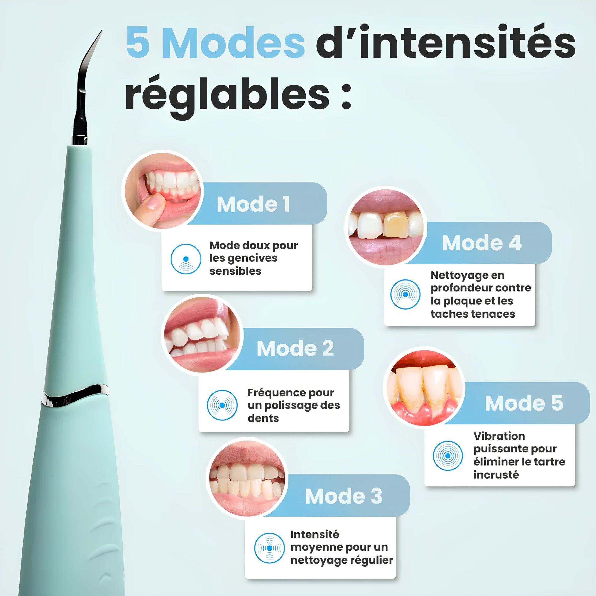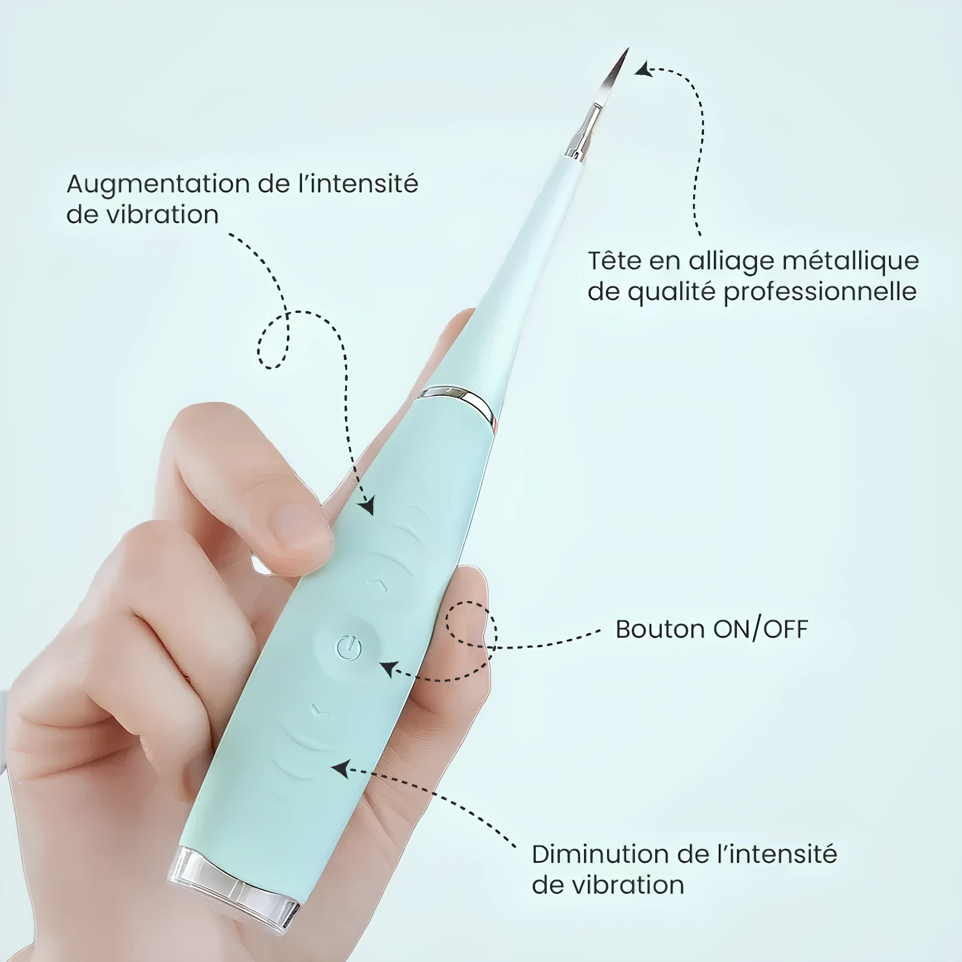 Retrouvez un sourire plus blanc et une sensation de propreté professionnelle directement chez vous. Notre Détartreur Dentaire à Ultrasons utilise une technologie de vibrations ultrasoniques haute fréquence pour aider à décoller la plaque dentaire, le tartre et les taches superficielles.